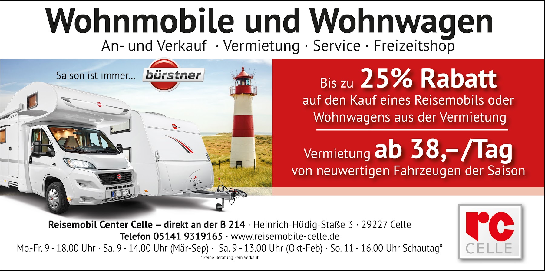 Die RC Reisemobilcenter-Celle GmbH im Zusammenschluss mit der alt bekannten Holiday Mobil GmbH (https://holiday-mobil.de) existiert mit Ihrer Fachwerkstatt und dem Campingshop als eines der führenden Unternehmen im Bereich Verkauf und Vermietung von Wohnmobilen und Wohnwagen seit 1999 und somit mehr als zwei Jahrzehnte in einer Hand als Ihr Caravan Partner in Celle (Niedersachsen).