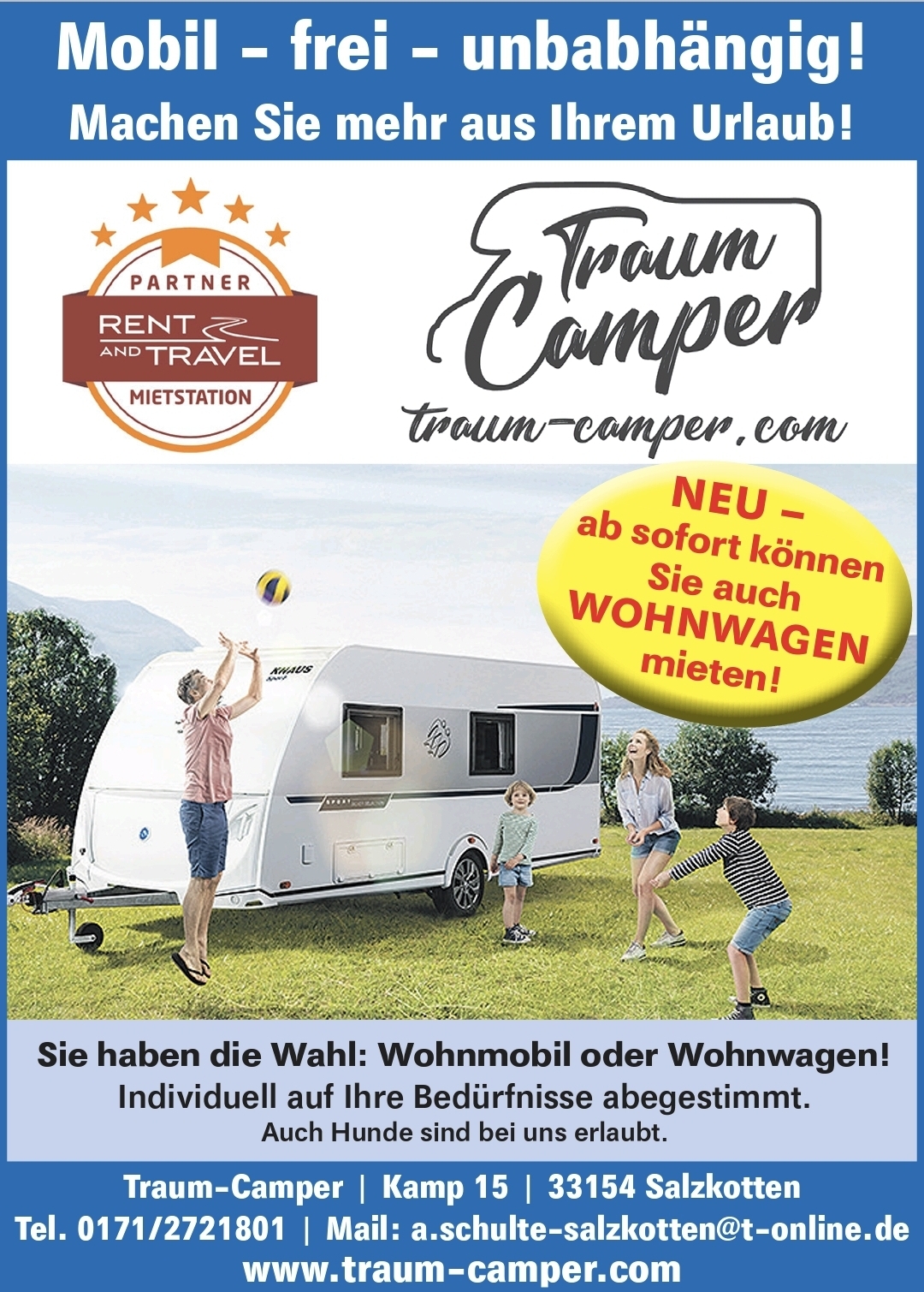 Seit Jahren erfreut sich das Reisen mit dem Wohnmobil immer größerer Beliebtheit. Der Wunsch, den Urlaub frei von Zwängen und in der Natur zu erleben, ist der Wunsch von vielen Menschen. Mit unserer Wohnmobilvermietung können Sie diesen Traum wahrmachen. Besonders Kinder und Ihr Hund wird Spaß an einem individuellen Campingurlaub haben. Bei unserer Wohnmobilvermietung erhalten Sie für jeden Anspruch genau das passende Fahrzeug. Vom kompakten Van bis zum großen Familienwagen wählen Sie aus vielen Modellen, noch mehr Grundrissvarianten und jede Menge Ausstattungsoptionen Ihr ganz persönliches Traumreisemobil.